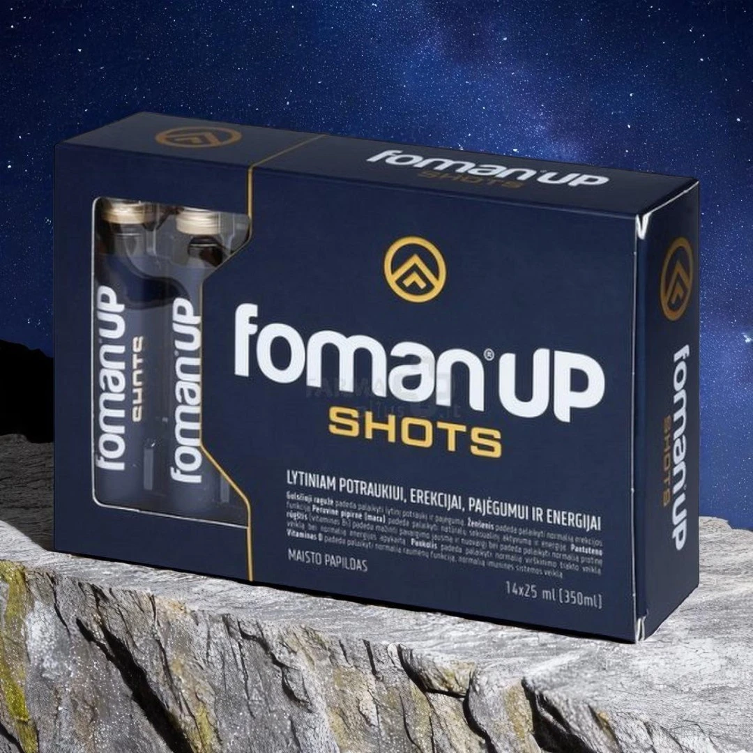 Foman UP Shots 25 ml x 14 vnt. – tai maisto papildas, sukurtas specialiai vyrams, norintiems pagerinti savo lytinę sveikatą, ištvermę ir energiją. Šis papildas sujungia natūralius augalų ekstraktus ir vitaminus, kurie padeda palaikyti normalią erekcijos funkciją, padidinti lytinį potraukį ir suteikti daugiau energijos kasdienėse situacijose.